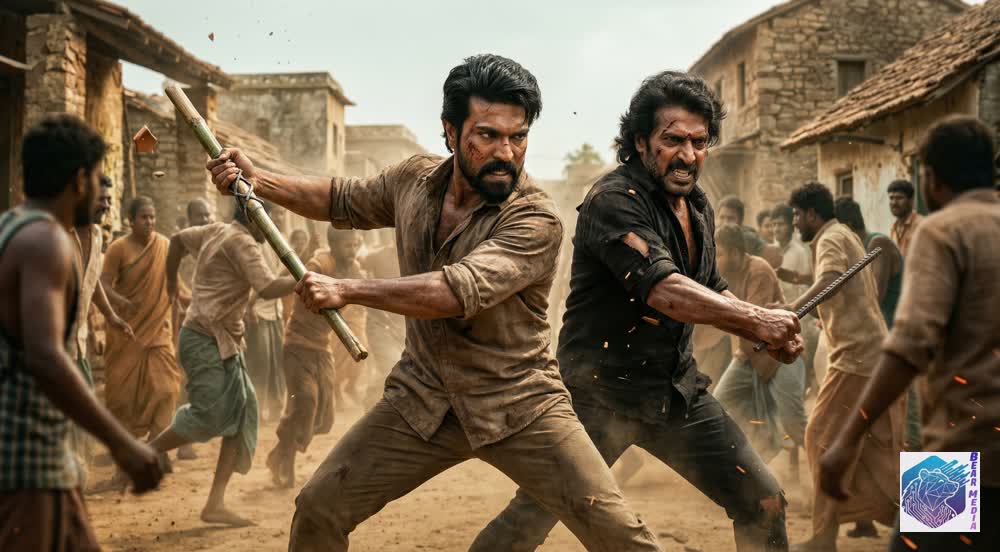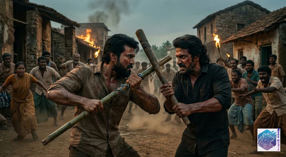 The village street transforms into a corridor of chaos. Bodies collide in the sweltering heat, the air thick with screams and the deafening crack of wood against bone. Peddi charges through the center of the madness, his weapon raised, tearing through the suffocating cloud of kicked-up dirt. It is a terrifying ballet of survival, where friend and foe blur into silhouettes of desperation. The earth itself seems to fracture under the weight of their collective fury…