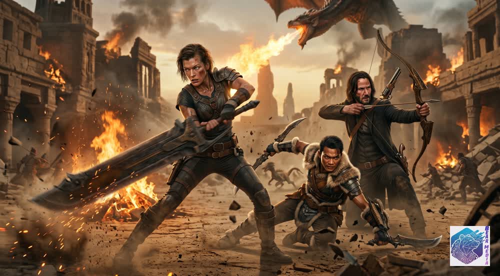 The earth fractures beneath their boots as the titan makes landfall. Fire washes over the ancient stone, reducing history to glass. Frontline dispatches echo across the outposts: ‘The Crimson King has fallen upon the ruins; send no saviors, only steel.’ In the suffocating heat, three warriors stand shoulder-to-shoulder, their differences burned away by the singular, overwhelming necessity of survival. An arrow flies. A blade swings. A desperate leap into the maw of death.