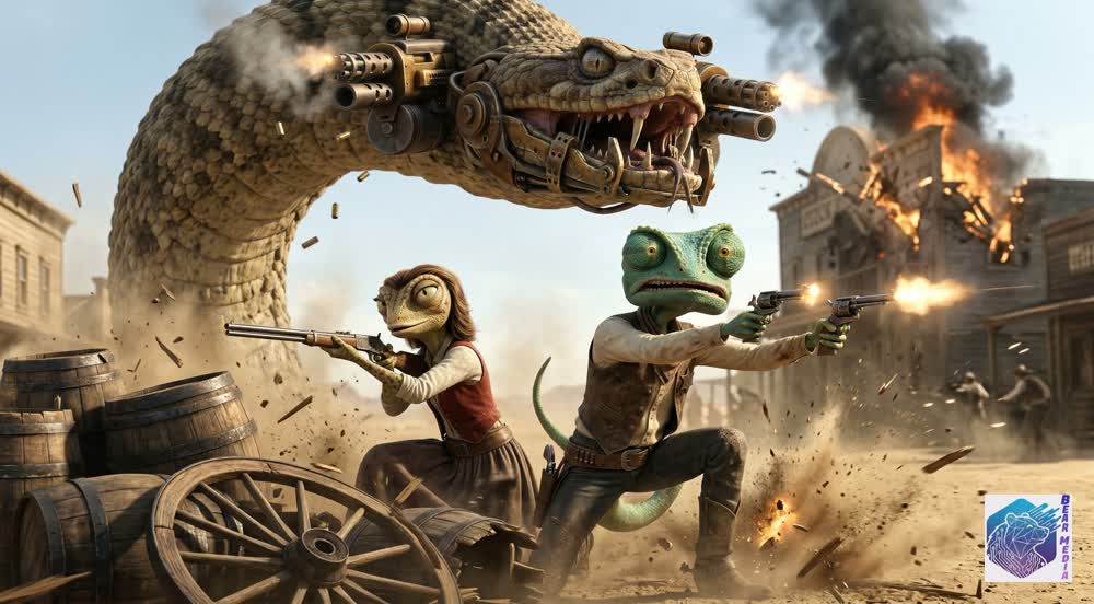 The canyon erupts in a symphony of fire and hissing steel. As the giant serpent unleashes a rain of bullets from its roaring sides, the earth shatters. Rango and Beans find themselves separated by a wall of smoke and debris, the roar of the monster drowning out their cries. It is the crucible of the frontier… the moment where the myth of the hero and the terrifying reality of death collide in a deafening crescendo.