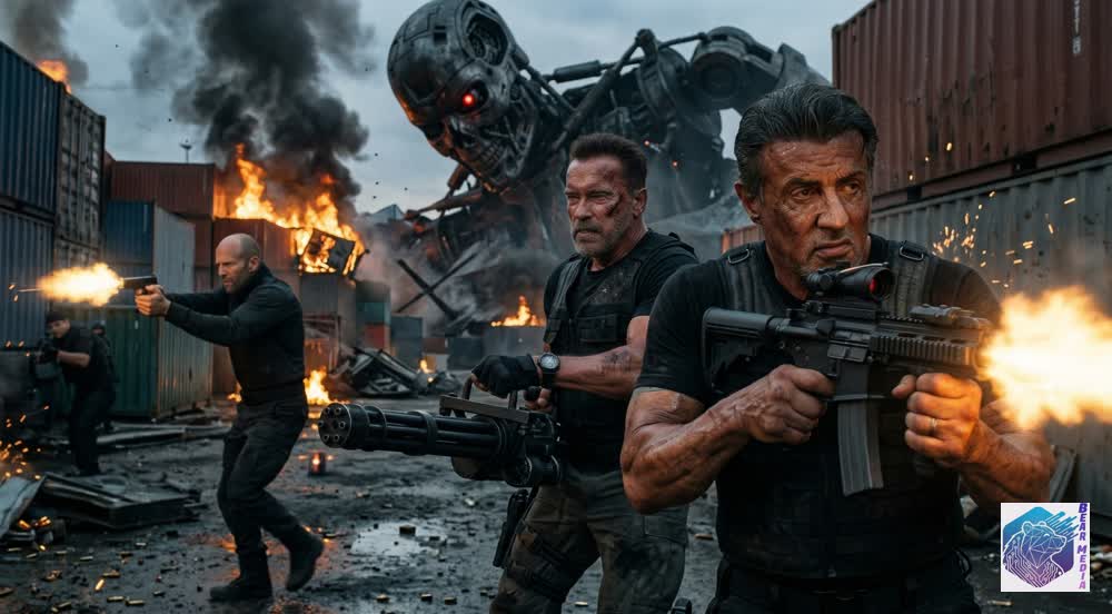 The container yard erupts into a breathtaking, apocalyptic symphony of gunfire, roaring flames, and cascading explosions. Barney ross swings his rifle, carving a brutal, kinetic path through the relentless tactical units, his every shot a violent rejection of the new order that wants them gone. Beside him, Christmas unleashes a torrent of quick, precise fire, dodging large-caliber rounds and falling debris as the sky turns into a vortex of explosive terror. Trench, with his massive weapon, creates a wall of fire, proving that old blood still has enough fury to hold the line against an army. It is a breathless, chaotic struggle through burning industrial structures and crushed concrete barriers, where every empty magazine dictates the survival of the legend.