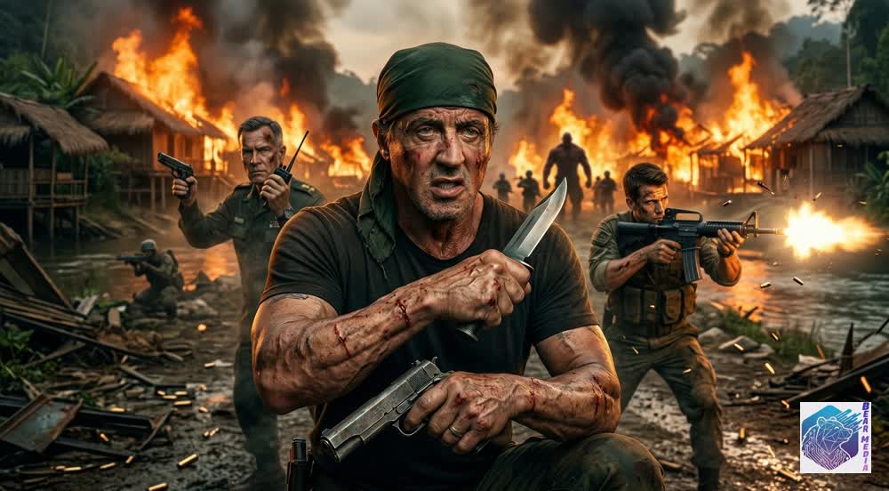The shallow waters turn into a breathtaking, apocalyptic symphony of gunfire, splintering wood, and roaring explosions. Rambo moves like a predator through the stream, carving a brutal, kinetic path through the raiding forces, his every strike a violent rejection of the modern war machine that seeks to consume the quiet places. Beside the burning huts, the local defenders find their courage, unleashing a torrent of fire as the sky turns into a vortex of orange heat and grey ash. It is a breathless, chaotic struggle through murky water and collapsing bridges, where every thrust of the blade and every arrow loosed dictates the survival of a people.
