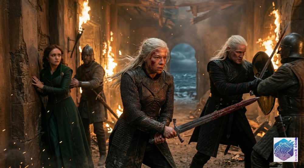 Her face is a fortress of resolve, carved with the lines of lost sons and a fractured inheritance. In the center of the frame, she stands, clad in the scaled armor of her house, a sword held with a grip of steel and sorrow. She is the chosen queen, the bearer of a promise that a world tries to break. Her eyes do not just stare at an enemy; they see the terrible price that must be paid for a crown that was never free. She is a queen who must decide how much of the world must burn to wash away a lie. A mother who must choose a throne over a child’s life.