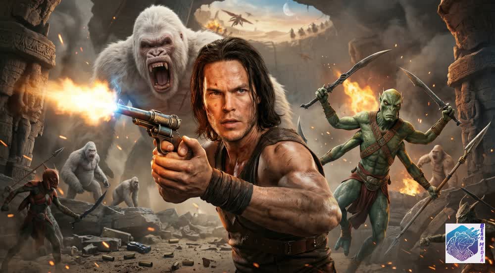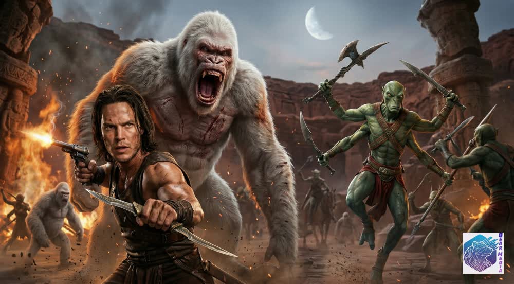 His skin bears the grime of a hundred battles, yet his eyes reflect the soul of a man permanently torn between two worlds. He grips a smoking revolver in one hand and a carved blade in the other, standing as the lone, fragile bridge between human vulnerability and Martian legend. He is no longer the lost cavalryman wandering the desert; he is the reluctant warlord of a dying planet, bearing the crushing weight of a crown he never asked for.